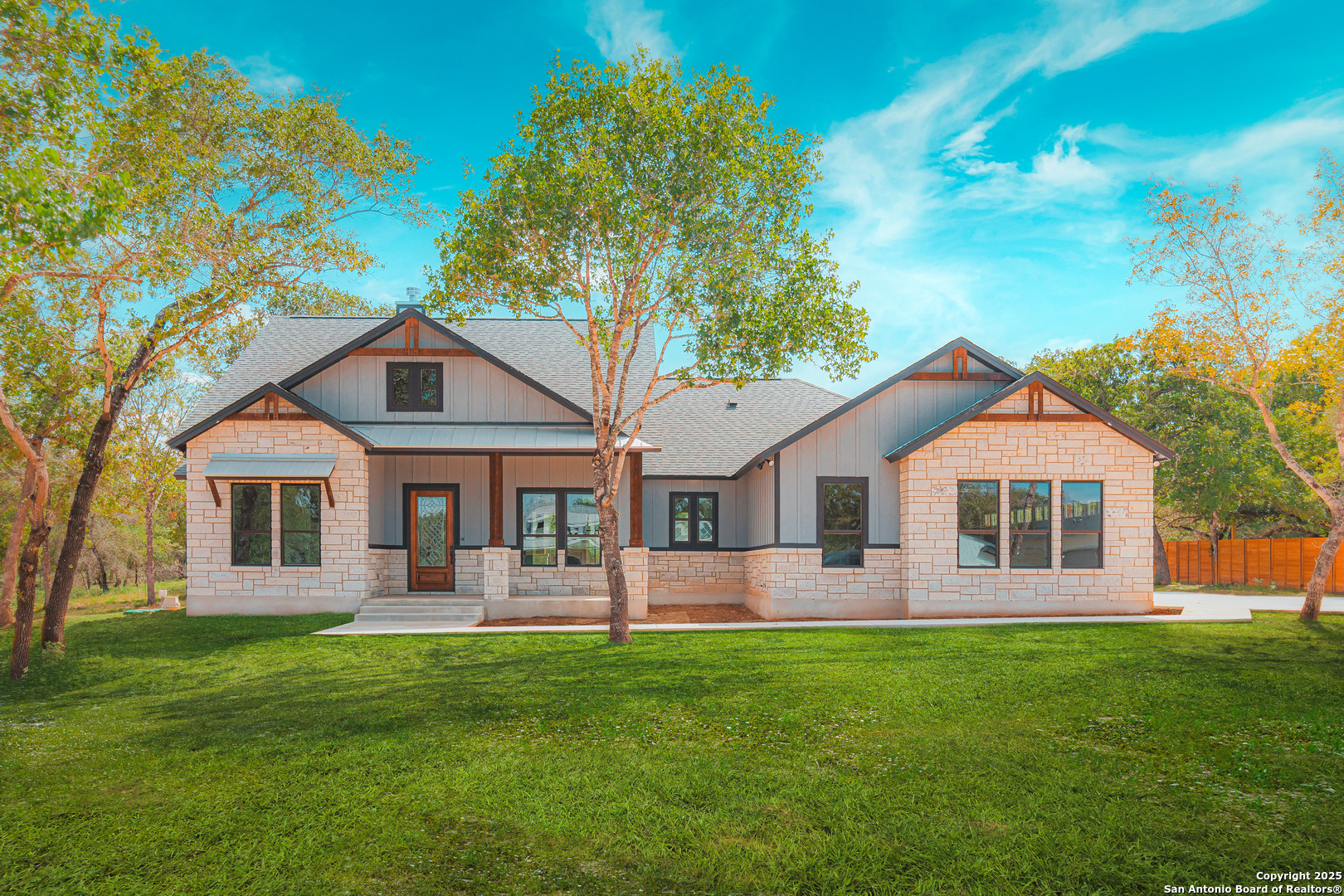 Stunning New Home on 1.64 Acres in the esteemed Eden Crossing community, Privately Situated in a Unique & Desirable location: on a cul-de-sac & bordering larger acreage tracts! Enjoy the best of Texas Country Living, with the convenience of Fiber Internet and a 30-minute commute to San Antonio. Thoughtfully designed, this newly crafted residence boasts numerous upgrades, including the attached Oversized 3-Car Garage, Spacious Front Porch & Back Patio, a Soothing Color Palate, and 3 Full Baths! The focal point of the Great Room is the Grand Floor-To-Ceiling Fireplace, ready to host special times together as the cooler season approaches. Dream Island Kitchen includes an abundance of custom cabinetry in two-tone finish, with chic matte black hardware, accented by the Stainless Steel KitchenAid Appliances, and sleek Quartzite Counters. Don't miss the generous pantry w/extra cabinetry! The Master Retreat showcases views of the wooded surroundings, and offers a luxury bath: dual sinks, free-standing tub, walk-in shower, and a roomy closet. Spectacular Laundry Room: Cabinetry + Sink, and deco tile floor in laundry room & pantry! The 3rd full bath is designed w/door to patio, great for outdoor activities or future pool. All-tile flooring (no carpet!), Quality Finishes throughout, Builder 1-2-10 year Bonded Warranty for peace of mind. Tranquil country ambiance on the expansive back patio ... Exceptional!