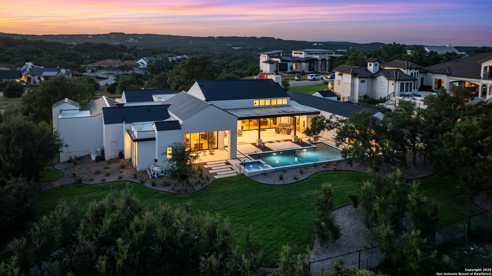 Discover 11136 Barreal, a stunning newly built modern ranch-style home in the exclusive Pecan Springs community of Boerne, TX. Offering 5,173 sq. ft., this luxury residence features 4 bedrooms with private en-suites, soaring ceilings, and walls of windows that flood the home with natural light. The chef's kitchen boasts waterfall quartzite countertops, custom cabinetry, and premium appliances, seamlessly connecting to the spacious living and dining areas with a sleek fireplace centerpiece. Retreat to the primary suite oasis with pool views, spa-inspired bath, soaking tub, oversized shower, and dual vanities. Enjoy resort-style outdoor living with a covered patio, sparkling pool, and spa, all set against beautifully landscaped grounds. Additional highlights include wide-plank hardwood floors, designer lighting, a gated driveway, and a side-entry garage-all just minutes from downtown Boerne, top-rated schools, and Hill Country attractions.