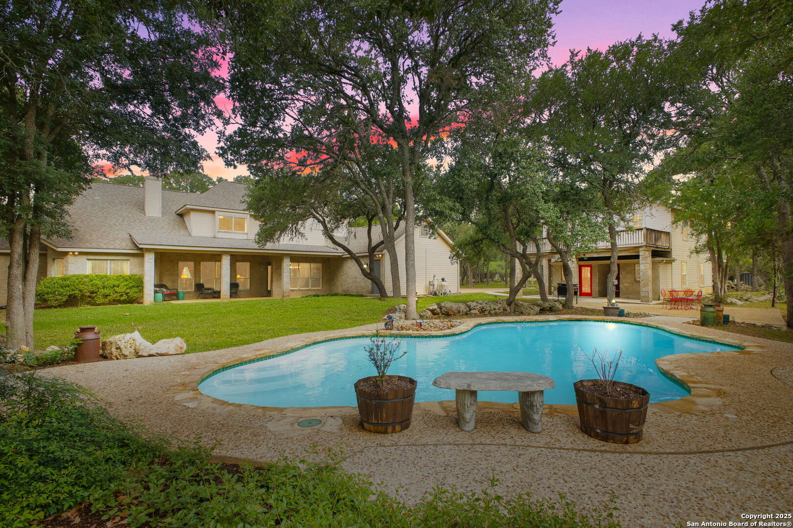 ** OPEN HOUSE SATURDAY 9/27 12-2pm AND SUNDAY 9/28 3-5pm!** Discover Hill Country living on 5 acres with NO HOA in Boerne! Charming farmhouse-style 3415 SF Main Home paired with a private 1783 SF Guest House-ideal for multi-generational living, a detached office, or income opportunity! The main residence offers 5 spacious bedrooms, 2.5 baths including a unique Jack & Jill, and an inviting kitchen with island, custom cabinetry, and abundant storage that flows into open dining and living spaces. The primary retreat features a spa-inspired bath with double custom vanities and oversized shower. Step outside to a private backyard oasis featuring a sparkling pool, covered patio, and expansive space beneath mature shade trees-perfect for relaxing or entertaining. The guest house adds nearly 1,800 SF with its own entry, 2 living areas, 1.5 baths, and endless versatility. Property also includes an enclosed animal pen for chickens, goats, or 4H/FFA projects. Just beyond the fence, discover level acreage with a deer feeder and seasonal creek. All this within Boerne ISD and minutes from I-10, La Cantera, The Rim, and Historic Downtown Boerne.