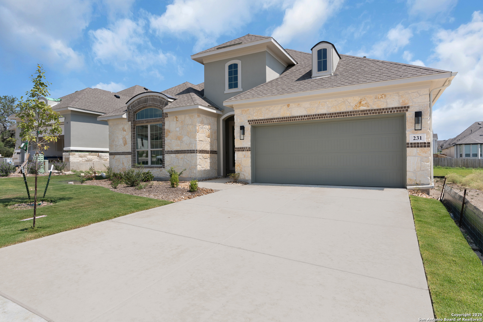 Beautiful west facing (Durango floor plan) garden home with high ceilings, large covered east facing patio, side patio and 2 car garage. Nestled in the Ranches at Creekside luxury garden home section on a manicured greenbelt with quick acess to Highway 46 and a short drive to downtown Boerne, HEB and IH10. This home has 3 bedrooms, 3 full baths and features include: pantry and 2 large storage closets; large fixed glass windows which give plenty of interior light; open floorplan with bathroom for each bedroom; 5.1 surround sound pre-wired, z-wave package and 2 pre-wires for security cameras.
