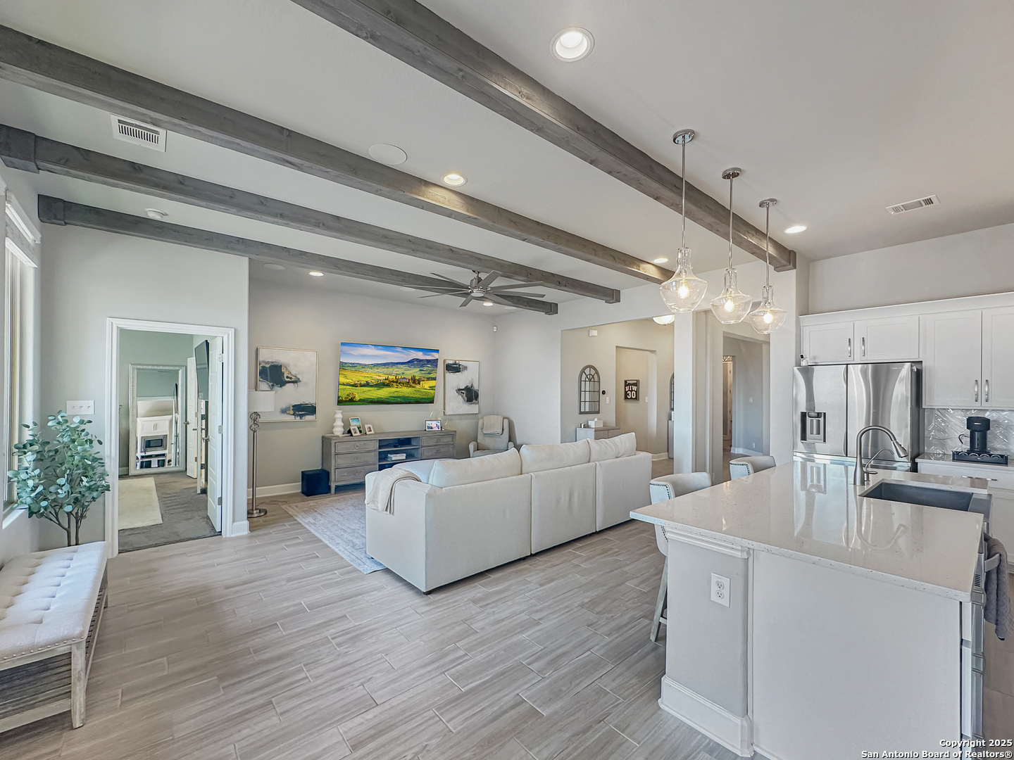 Looking for a beautiful single level house with views? Welcome to this stunning single-story Ashton Woods home offering 3 bedrooms, 2 bathrooms, and 2,159 square feet of thoughtfully designed living space. Situated to capture breathtaking long-range views of the Texas Hill Country, this property blends comfort, style, and functionality. Step inside to an open-concept layout featuring a spacious kitchen with a gas cooktop, built-in double oven & microwave, and an oversized quartz island with sink that opens seamlessly to the family room. The family room boasts tall ceilings with exposed beams, creating a warm yet airy atmosphere perfect for gatherings. A private dining room and a dedicated office provide versatile spaces for both work and entertaining. The split-bedroom design ensures privacy, with the primary suite tucked away for peaceful retreat along with a double quartz vanity, a walk-in glass shower and soaking tub. The two guest bedrooms are located near the front of the house and they share a guest bathroom with a tile shower and quartz vanity. The spacious laundry room is plenty large enough to house an additional refrigerator while the garage offers a an EV charger. Exterior highlights include a combination of stone and brick on three sides, offering timeless curb appeal, and a rear Trex deck patio ideal for enjoying morning coffee or evening dinners while soaking in the panoramic Hill Country views. This home truly delivers the best of Hill Country living-modern design, quality finishes, and unmatched scenery-all on one level. Put 27830 Spanish Peaks on your short list!