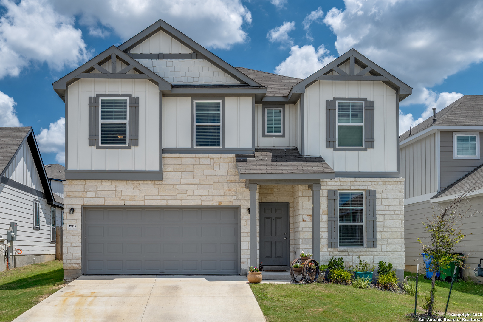 Welcome to your dream home in the sought-after Cielo Ranch community of Boerne! This spacious 4-bedroom, 3-bath home features a versatile layout with a full bedroom and bath on the main level- perfect for guests or multi-gen living. The gourmet kitchen boasts granite countertops, stainless steel appliances, an island, and gas cooking - ideal for everyday meals or entertaining. Upstairs, the private primary suite offers a large walk-in closet and a spa-like walk-in shower. You'll also find a convenient upstairs laundry room, a generous loft/second living area, and two additional bedrooms with a shared full bath. Step outside to a large backyard with your dream patio- perfect for outdoor gatherings. Located in Boerne ISD with an ASSUMABLE 5.25% FHA LOAN. This home combines comfort, flexibility, and unbeatable value in a prime location. Don't miss it!
