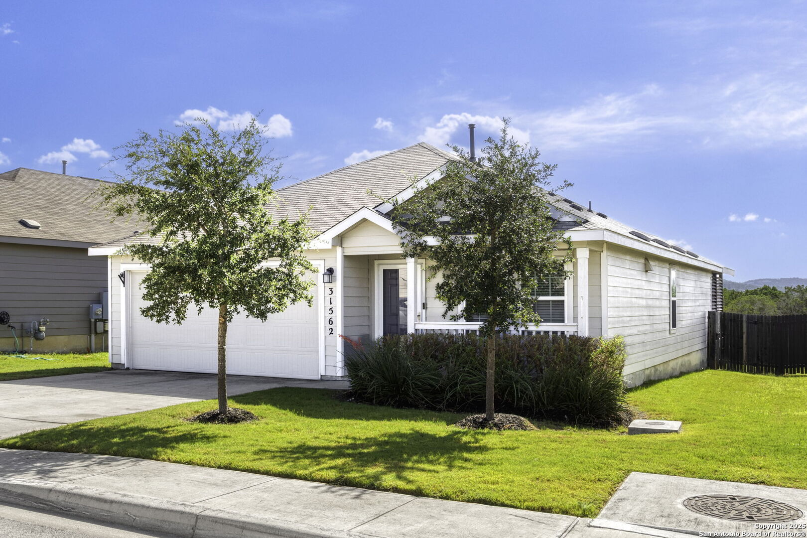 Located in the tranquil and desirable Hidden Trails community within Johnson Ranch, this impeccably maintained 3 bedroom, 2 bathroom home sits on a premium lot that backs up to a lush greenbelt. The stunning, expansive backyard deck consists of two walls on each side for ultimate privacy, and offers breathtaking views of the Hill Country. The deck is made from composite boards resistant to fading, staining, mold, and rot, and perfect for entertaining or unwinding after a busy day. Step inside to discover a spacious open-concept living area, modern kitchen featuring sleek countertops, stainless steel appliances, and gas cook top. The large built-in island flows effortlessly into the dining area and warm family room with views of your private, fully fenced backyard and green belt view. This Lennar home offers the Gannes floor plan featuring 2 full shower/tub combo bathrooms, 3 large bedrooms and a 2 car garage. Step outside to enjoy resort-style amenities, including: Splash pad for kids, Junior Olympic-sized lap pool, infinity pool and 24/7 gym, fitness center, community center and clubhouse. Additional amenities include Two playgrounds, one featuring a zip line, biking and walking trails, a dog-friendly park, BBQ areas, Basketball courts, and a Catch-and-release fishing pond.