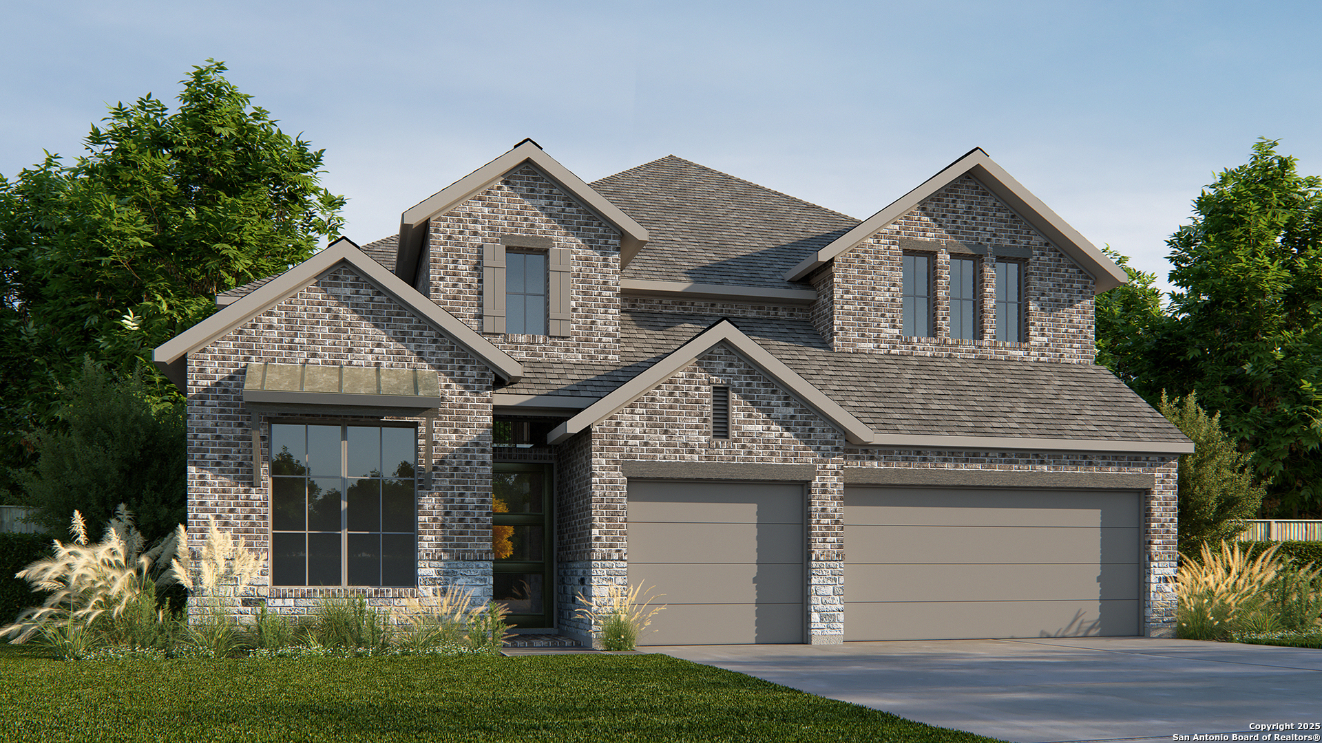 Home office with French doors frames the 19-foot entry. Generous family room with a grand wall of windows, a cast stone fireplace and a 19-foot ceiling flows into the dining area. Island kitchen with built-in seating space features a walk-in pantry and 5-burner gas cooktop. Secluded primary suite features a grand bedroom with a wall of windows. Primary bathroom offers a double door entry, dual vanities, freestanding tub, separate enclosed shower and two walk-in closets. Guest suite with full bathroom and walk-in closet on first floor. Second level hosts secondary bedrooms, a Hollywood bathroom, a media room with a storage closet and a game room with three large windows. A utility room and a half bathroom complete this generous design. Covered backyard patio. Mud room just off the three-car garage.