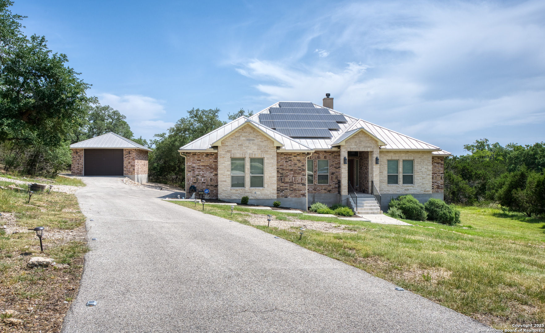 Ask about the VA assumable loan at 2.625%. Discover the perfect blend of comfort, functionality and Hill Country charm in this beautifully designed 3-bedroom, 2.5 bath single-story home that offers an expansive 3009 sq ft of thoughtfully crafted living space with an open floor plan, dream kitchen, formal dining, two living areas, spacious dual primary bedroom closets, safe room, and abundant natural lighting in an accessible home! Set on on a spacious 6.39 acre lot, the property features a 3-car attached garage plus a detached 2-car RV-height garage, providing ample room for vehicles, recreational gear or workshop space. Eco-conscious buyers will appreciate the solar panels with battery backup and a large water tank, enhancing energy efficiency and sustainability. With its mix of modern amenities and practical upgrades, this home is ideal as a full-time residence or a luxurious Hill Country getaway. Schedule your private tour today!