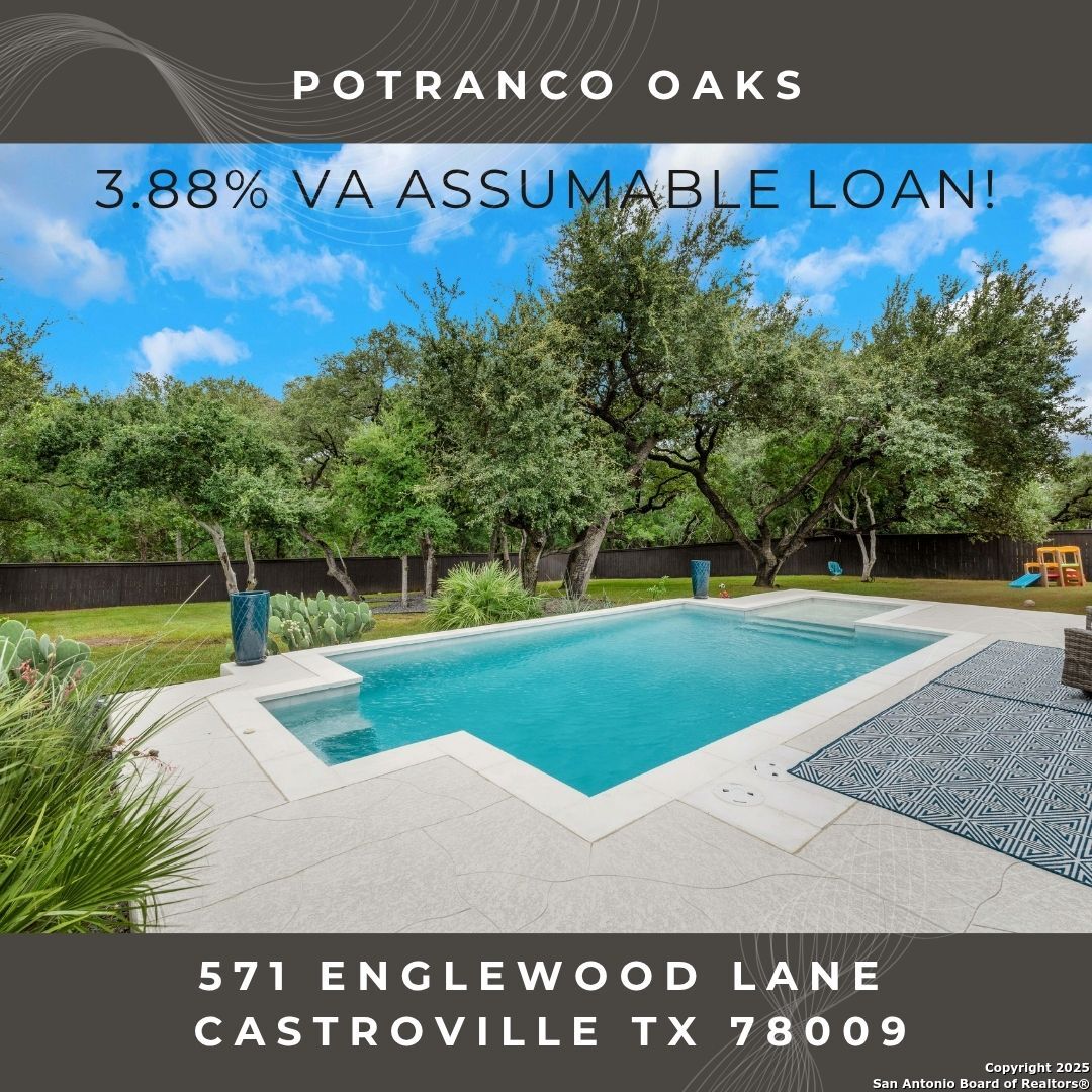 3.88% VA Assumable Loan available! Congratulations! You have found your next home! This absolutely stunning one-story home features one of Chesmar's most popular floor plans with soaring ceilings and a wide open layout that's built for both everyday living and entertaining! At the heart of the home is a spacious family room complete with custom-built-ins and a dramatic fireplace! The chef's kitchen features double islands, an oversized walk-in pantry, TONS of cabinetry and counter space, a reverse osmosis system, stainless steel appliances including a GE Profile five-burner gas cooktop, a convenient pot filler, and not one but two breakfast bars! Step outside to experience the incredible outdoor living area, beginning with a screened-in patio showcasing a cozy gas fireplace and stamped concrete floor. This opens to what just might be the most impressive backyard in the neighborhood! Enjoy the luxury of an in-ground pool with quad massaging jets, a sun deck with a sparkling fountain, and a state-of-the-art system that allows the pool to be heated or cooled to your preference. The .47 acre greenbelt lot is fully fenced and has a full sprinkler system to take care of the 20 mature trees that shade the professionally landscaped yard! The private primary suite offers custom window treatments, direct access to the outdoor living area, and a spa-like bathroom with a freestanding soaking tub, oversized walk-in shower, dual vanities, linen storage, and a custom walk-in closet with triple hanging rods and built-ins. Each spacious secondary bedroom has a private bath & a walk-in closet! The dedicated study features 12' ceilings and French doors for the ultimate work at home space! All mounted televisions are INCLUDED! Luxury utility room with cabinets, granite counters, refrigerator space, hanging rod and a drop zone just outside the door! The three car split garage boasts epoxy floors, custom storage shelving and a Defender Series water softener! Great location with easy access to Highway 90 & Loop 1604! Located in Medina Valley ISD with convenient access to Highway 90 and Loop 1604. Just minutes from Castroville attractions including Alsatian Golf Club, Castroville Regional Park, Haby's Alsatian Bakery, the Hillside Boutique Hotel, and more!