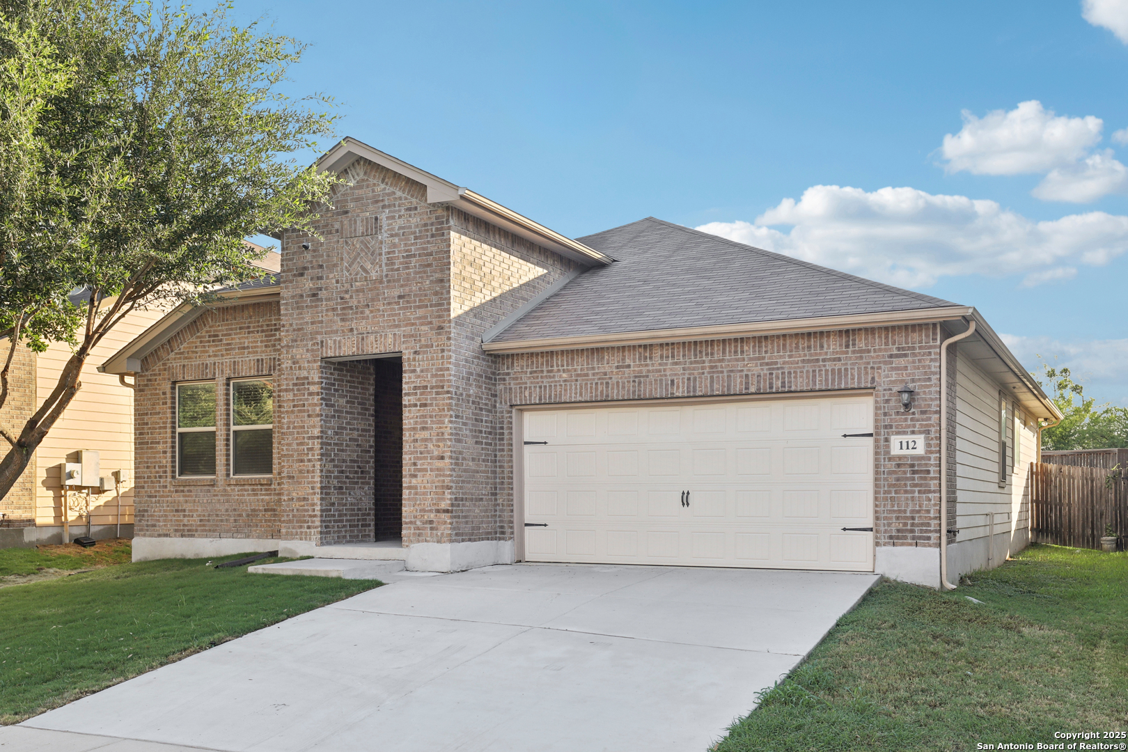 Welcome to 112 Grand Vista, a charming single-story home featuring 3 bedrooms, a versatile flex room, and 2 bathrooms. A beautiful front archway and mature trees create an inviting curb appeal. Inside, the open floorplan is filled with natural light, with a spacious kitchen that includes a large island with seating and abundant cabinet space. The primary suite offers a private bathroom with dual vanities, a garden tub, and a separate shower. Enjoy outdoor living on the large covered patio overlooking a fully fenced backyard for added privacy. Recent updates include a new A/C unit with a 10-year warranty, prep for a water softener, and a dishwasher in excellent condition. Located in the Cibolo Vistas community, residents enjoy access to a park, pool, and splash pad!