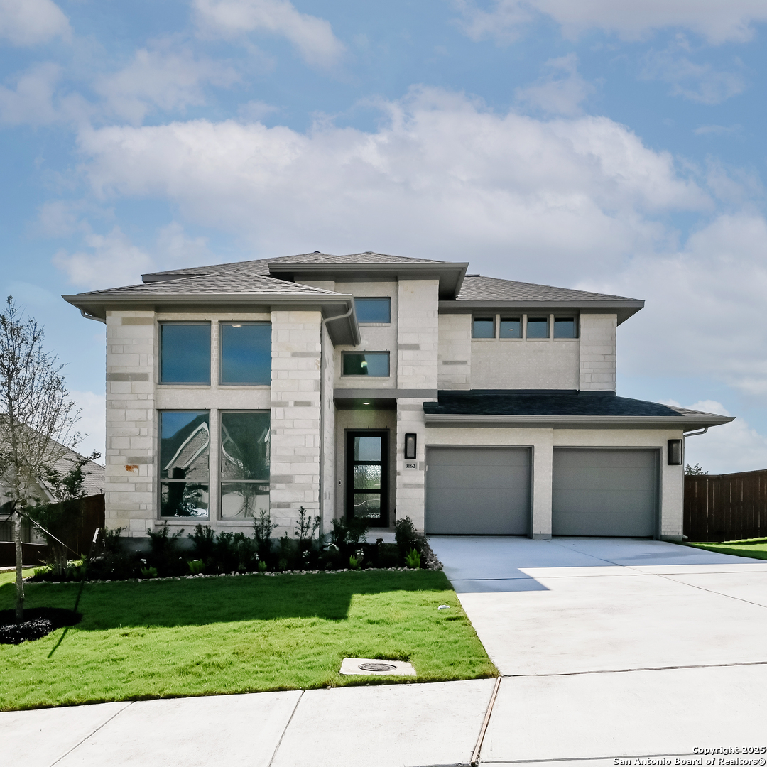 Home office with French doors set at two-story entry. Two-story family room with wall of windows opens to kitchen and dining area. Kitchen hosts inviting island with built-in seating space and 5-burner gas cooktop. First-floor primary suite includes dual vanities, freestanding tub, separate glass-enclosed shower and large walk-in closet in primary bath. A second bedroom is downstairs. Two secondary bedrooms and a game room are upstairs. Extended covered backyard patio. Two-car garage.
