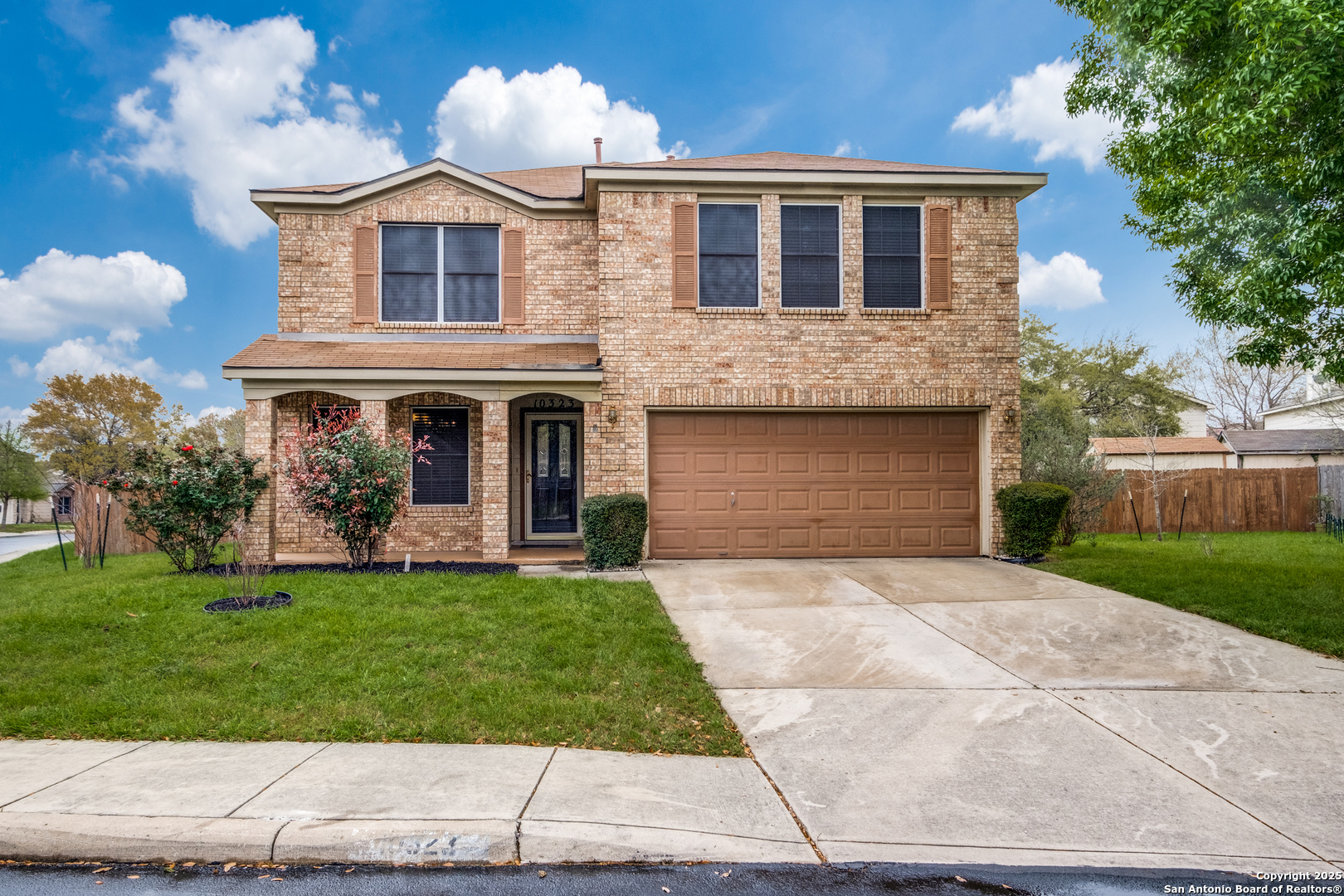 Move-in ready and yours for the taking, this well-maintained two-story home sits proudly on a spacious corner lot that leads into a quiet cul-de-sac, offering comfort, style, and convenience. A charming front porch with space for a garden table and chairs sets the tone for relaxation before you even step inside. With three bedrooms, two and a half bathrooms, and a two-car garage, this home is the perfect blend of function and charm. Inside, a cozy front seating area flows seamlessly into the dining room, creating an inviting space for both casual meals and formal gatherings. The open-concept kitchen and living room make entertaining effortless, with plenty of room to host family and friends. Upstairs, all bedrooms are thoughtfully tucked away alongside a spacious loft-ideal for a media room, office, or playroom. The primary suite serves as a true retreat, complete with a large en suite bathroom featuring a relaxing garden tub, separate shower, double vanity, and an oversized walk-in closet. Step outside to the expansive backyard, where a large covered patio and two storage sheds enhance the possibilities. With plenty of room to design your own personal oasis, the space is big enough for a pool or perfect for creating the ultimate outdoor entertainment area. Situated just minutes from Loop 1604, shopping and dining at The Forum, and only a 10-minute drive to Randolph and Brooks Air Force Base, this home offers an unbeatable combination of comfort and convenience.