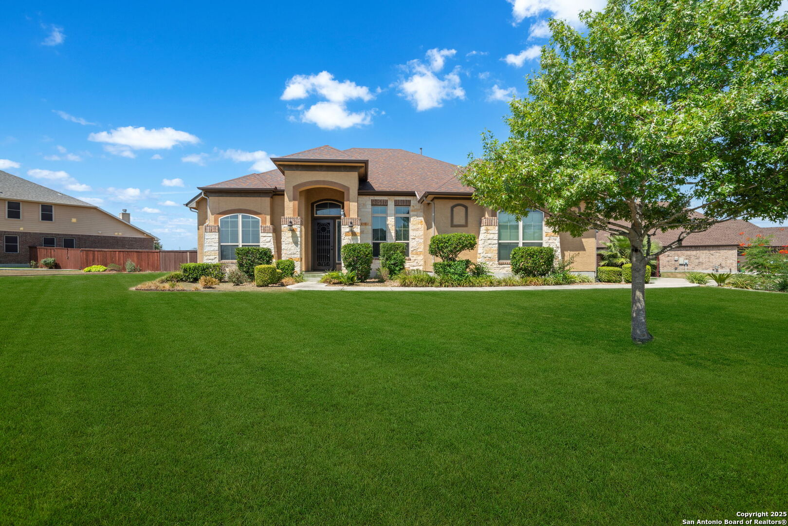 Stunning 1 Story Located in Quiet Creek! Home features - 4 Bedrooms * 3.5 Baths * 3 Car Garage * Study with French Doors * Large Gameroom * Formal Dining Room * In-law Suite with Full Bath * 12' Ceilings * 8' Doors Throughout * Hardwood Floors * Built-in Stainless Steel Appliances with Gas Cooktop * Bay Window at Owners Suite with Separate Garden Tub/Shower and Split Dual Vanity Sinks at the Owners Bath * 2" Faux Blinds * Tankless Gas Water Heater * Water Softener * Covered Front and Rear Patio * Epoxy Floors at Garage and Rear Patio * Front Yard Sprinkler System and more! Step into the backyard oasis which features a newly installed heated in-ground pool with an infinity edge spa, centered water feature, and piped water slide. Home sits on a .55 Acre lot!