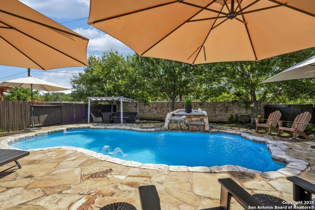 Impeccable design defines this one-and-a-half story home in a gated Helotes community, featuring a spacious, light-filled layout and custom finishes throughout. New chandelier and wood beam ceilings highlight the entry, while wood and tile flooring complement the open living space and private study. The stunning kitchen boasts a large island with seating, stainless steel appliances, double ovens, and walk-in pantry. Step outside to a true retreat with an outdoor kitchen, pool with fountain, and pergola for added relaxation. The primary suite is a peaceful retreat with views of backyard, custom closet, and spa like bath with split vanities. Additional upgrades include Sonos indoor/outdoor surround sound, new pool pump (Aug. 2025), stained fence (Sept. 2025), irrigation system, and water softener.