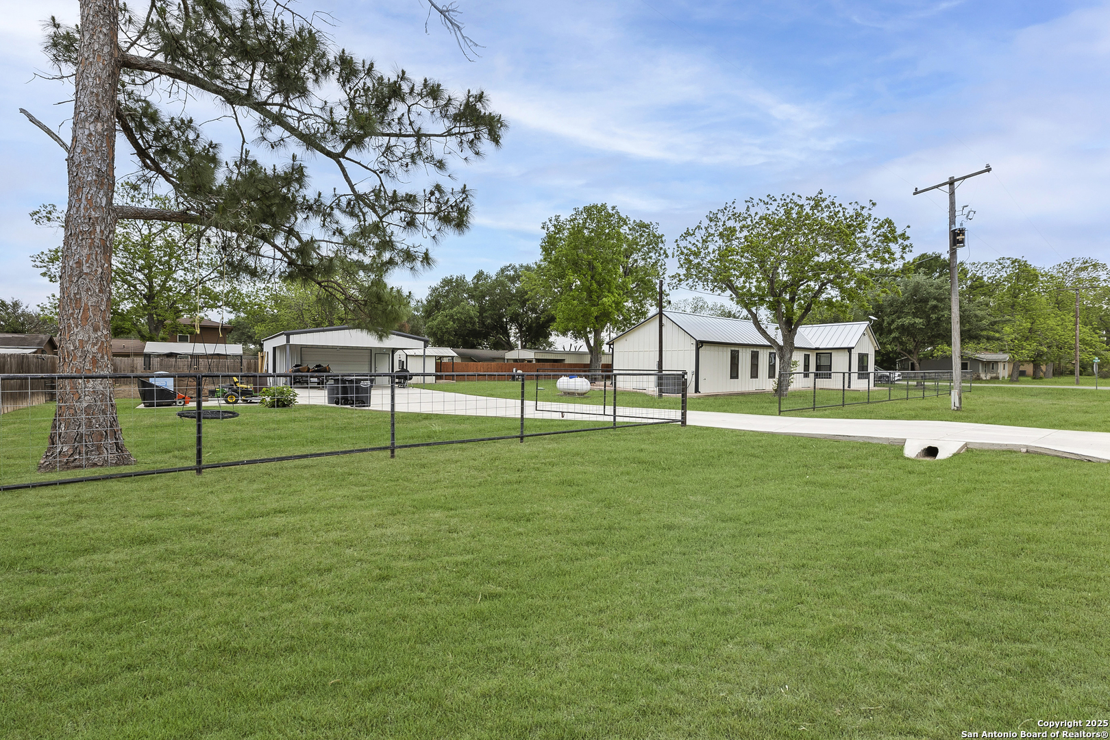 Designed for beauty, built for longevity. This fully custom, one of a kind 3 bedroom, 2.5 bath on nearly half an acre offers timeless style and modern efficiency. Gated drive, fenced yard, lush grass, and mature trees, including a producing fig and rare stately pine, create a park-like retreat. Inside you'll find vaulted ceilings with exposed wood beams, warm open living areas, and specially curated finishes. Outdoor living shines with a charming herringbone bricked front porch, large wood-plank stamped concrete back deck, and flourishing garden. The 24x40 shop with carport extension is perfect for hobbies, while a two-car garage on slab offers future potential as a casita, game room, office, or fully finished garage. Extended parking and sidewalks around the home make life seamless. Built for efficiency from top to bottom: metal roof, spray-foam insulation, 4-ton Ruud HVAC, updated water well, tankless water heater, foundation ventilation system. Modern tech touches include Starlink internet, Vivint security, and a hardwired speaker system. Falls City ISD, minutes from Floresville or Karnes City shopping, and an easy drive to San Antonio. Priced below independent appraisal, this home offers unmatched quality and design at an exceptional value.