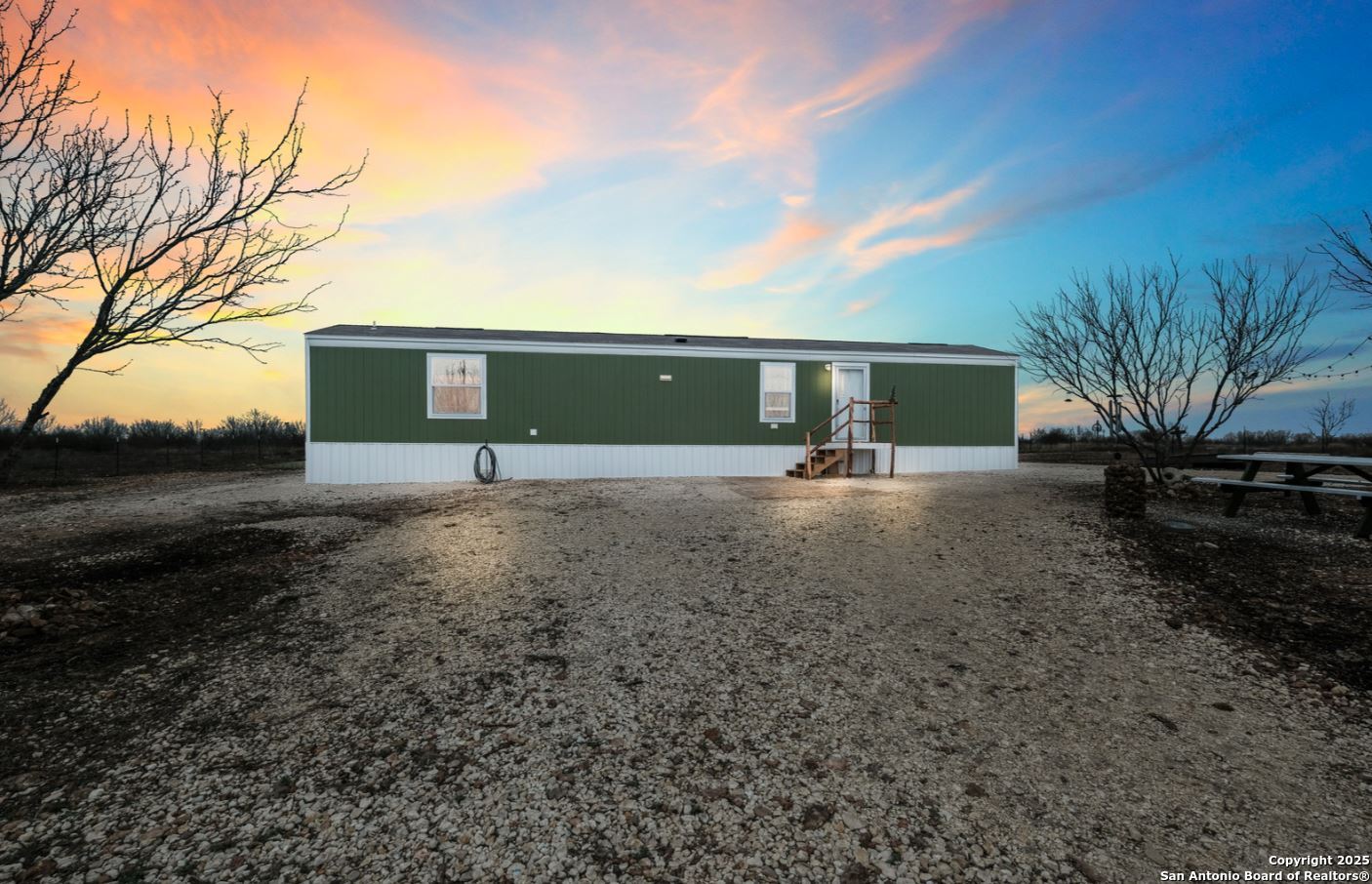 Discover this charming 2-bedroom, 2-bath home set on a full acre of fenced land in Dunlay, TX. Built just recently, it offers a clean, modern layout with an open living space and split-bedroom design for added privacy. The kitchen, dining, and living areas connect easily, creating a comfortable space for everyday life or hosting guests. Outside, the property is ready to enjoy with a circular drive, mature trees, and extras that make it truly move-in ready, including appliances, storage, a riding mower, and even outdoor seating for weekend cookouts. Utilities are in place and the home sits within the sought-after Medina Valley ISD, with quick access to Castroville, Hondo, and San Antonio. Perfect for anyone wanting peaceful country living without giving up convenience, this home is a solid choice for first-time buyers, downsizers, or anyone looking for a relaxing retreat.