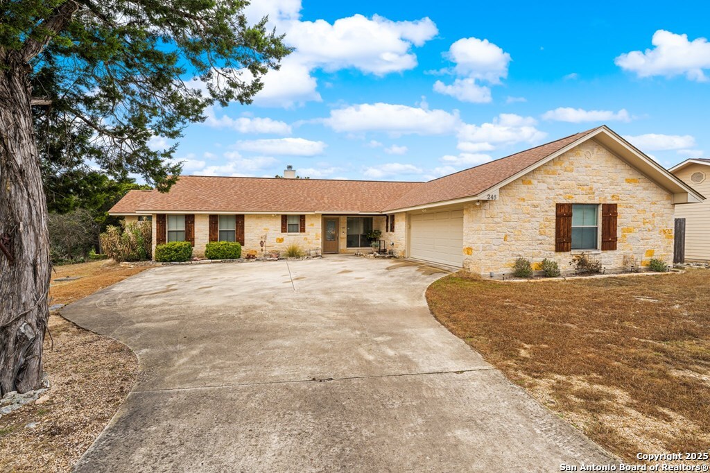 Charming 3-bedroom, 3-bathroom hill country home with a well-designed floor plan and quality craftsmanship throughout. The inviting living room features a cozy fireplace and a spacious area perfect for formal dining. Beautiful 18" ceramic tile flooring flows through the common areas, while the bedrooms are comfortably carpeted. The oversized kitchen offers a breakfast nook, stylish cabinetry, granite countertops, stainless steel appliances, and ample storage space. Step outside to the large back deck, ideal for enjoying scenic views and watching local wildlife. For added convenience, a fully insulated storage building with air conditioning provides the perfect space for a workshop or extra storage. All measurements are approximate and should be verified by buyer.