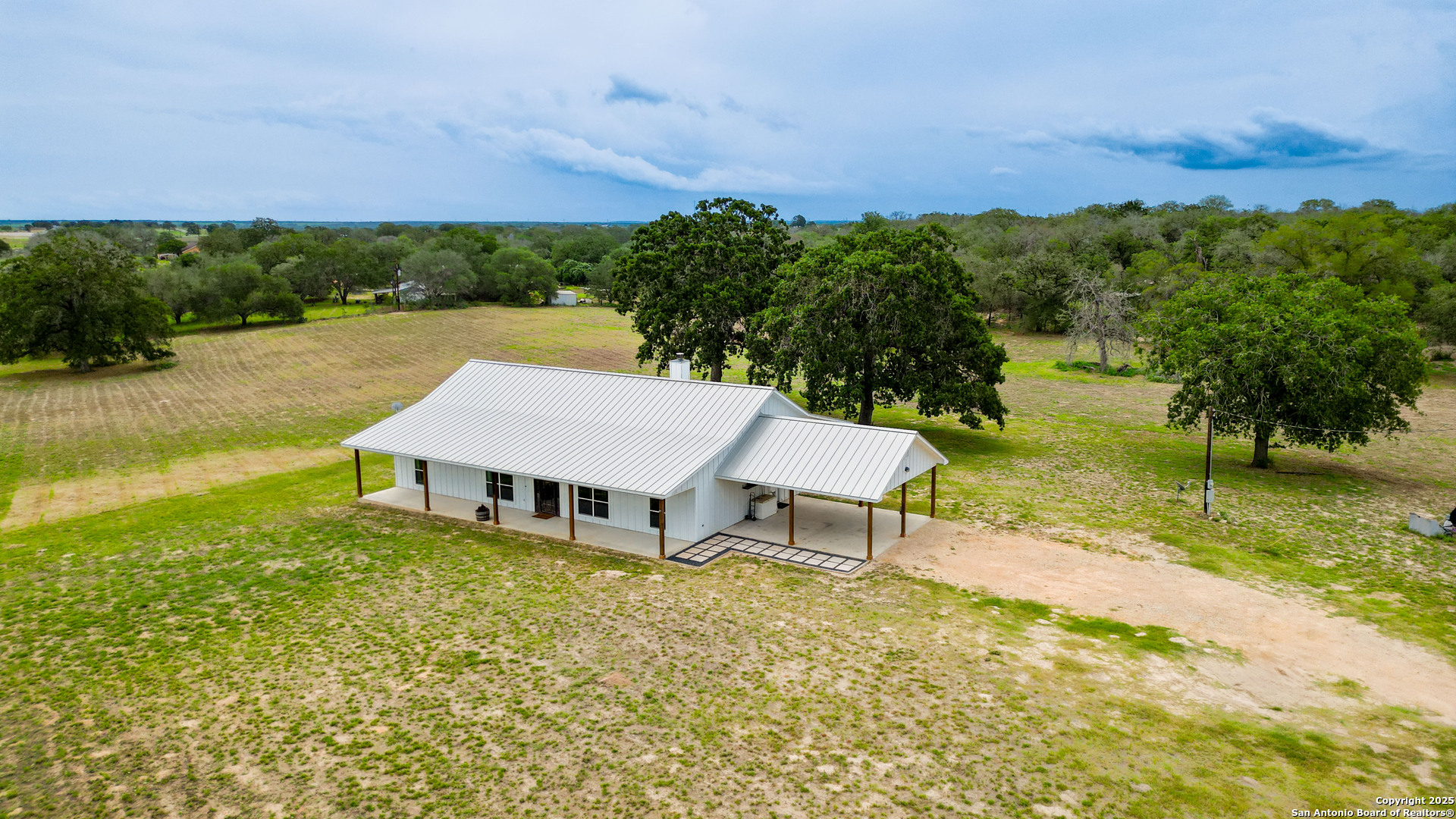 Welcome to 108 Santa Gertrudis in Sutherland Springs! This is the cutest farmhouse built in 2015 on 10 acres, perched on a little hill with views of trees, trees and more trees! This 2520 sq ft house has 3 bedrooms, 2.5 baths, an office plus a game room that could be used as a 4th bedroom. As you enter into this home from the huge covered front porch that spans the length of the house, you'll find an office on the right and an accent wall with antique barnwood. The living room has a vaulted ceiling with wood beams and a stone wood burning fireplace. A huge kitchen is right off the living room with custom wood cabinetry with pull out drawers, stone countertops, subway tile backsplash, farmhouse sink and a custom island with wood butcher block countertop great for cooking prep! You'll love the Kitchen Aid Double 30" double ovens and walk in pantry!! The laundry room is conveniently right off the kitchen and leads to the carport. The primary bedroom suite has outdoor access to the large covered back porch and a walk in closet with great storage/closet system. The primary bath has a custom double vanity, a large Jacuzzi tub and walk in shower. 2 additional guest bedrooms and guest bathroom with double vanity and tub/shower combo. Don't miss the gameroom (or 4th bedroom)on the other side of the house next to the powder bath. Wood tile through out, no carpet, standing seam metal roof and custom details galore. Mature oak trees, fully fenced and the home is on a private water well!