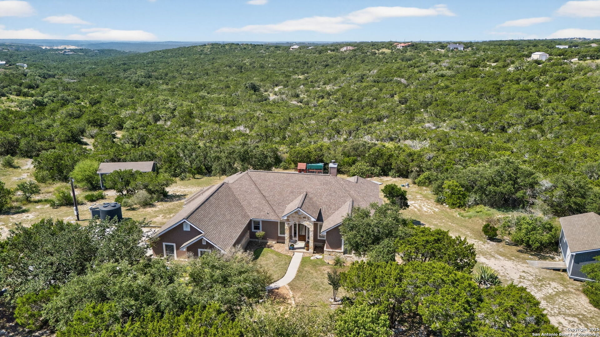 Spacious 1-story home on 5 acres with beautiful views off the back deck. Built in 2003, this 4-bedroom, 3-bathroom home offers a functional split floor plan with a large kitchen and comfortable living space featuring a wood-burning fireplace. Two storage buildings provide plenty of room for tools, equipment, or hobbies. Enjoy privacy and peaceful surroundings with plenty of space both inside and out. Medina Valley ISD.