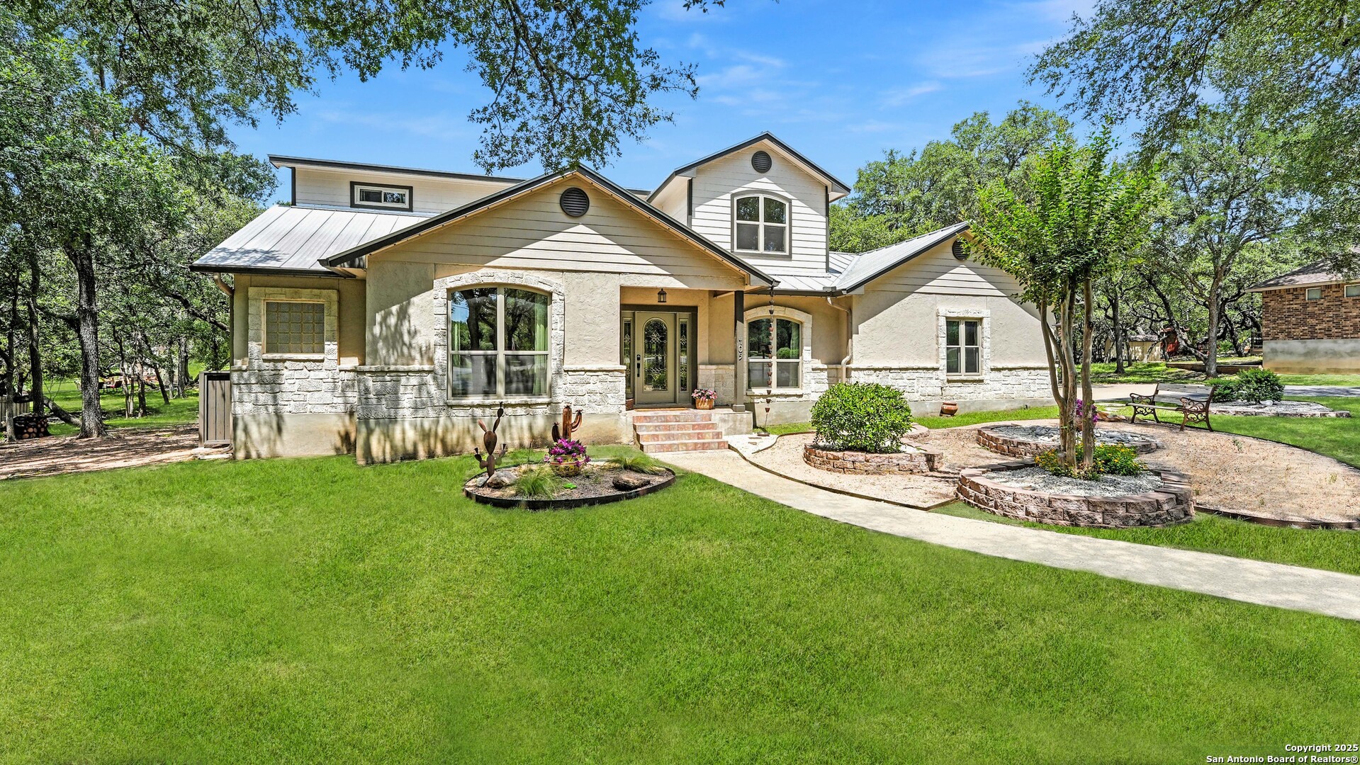 Welcome to this beautifully updated home nestled in the highly desirable Pinnacle community! From the moment you step into the inviting main living area, you're greeted by a stunning floor-to-ceiling stone fireplace and an abundance of natural light streaming through large windows, creating a warm and welcoming atmosphere. The updated eat-in kitchen is perfect for both daily living and entertaining, featuring granite countertops, stainless steel appliances, and ample cabinet space. A formal dining room offers a touch of elegance, while the home study/office provides a quiet retreat for remote work or reading. The spacious primary suite is a true sanctuary with rich wood flooring, patio doors leading to the outdoor oasis, multiple closets, and a large en suite bath complete with a soaking tub, separate shower, and double vanities. Upstairs, enjoy a bright open loft family room, two generously sized bedrooms, and a full bath. A split-bedroom design includes an additional 14'x10' climate-controlled bonus room-ideal for holiday decor storage, a hobby room, or creative studio. Step outside to a thoughtfully designed outdoor living area, recently updated with a low-maintenance composite deck, multiple seating areas, roller shades, a cabana with TV, and a charming flagstone walkway-perfect for hosting or unwinding. Notable updates include permanent LED holiday lights (app-controlled), spray foam insulation added at the garage, interior lighting upgrades, exterior stucco painted, new windows (2021), and metal roof (2019). Additional features include water softener, gutters, irrigation system, and storage shed. Nestled on a serene, 1 acre wooded lot, this property offers plenty of mature trees for privacy and shade, along with a picturesque dry weather creek that adds charm and a peaceful, natural backdrop to the outdoor living space. All of this is offered below the 2023 appraisal value-a fantastic opportunity to own a thoughtfully maintained, move-in ready home in one of the area's most desirable neighborhoods. Don't miss your chance to experience the perfect blend of charm, comfort, and modern updates. Schedule your private tour today!