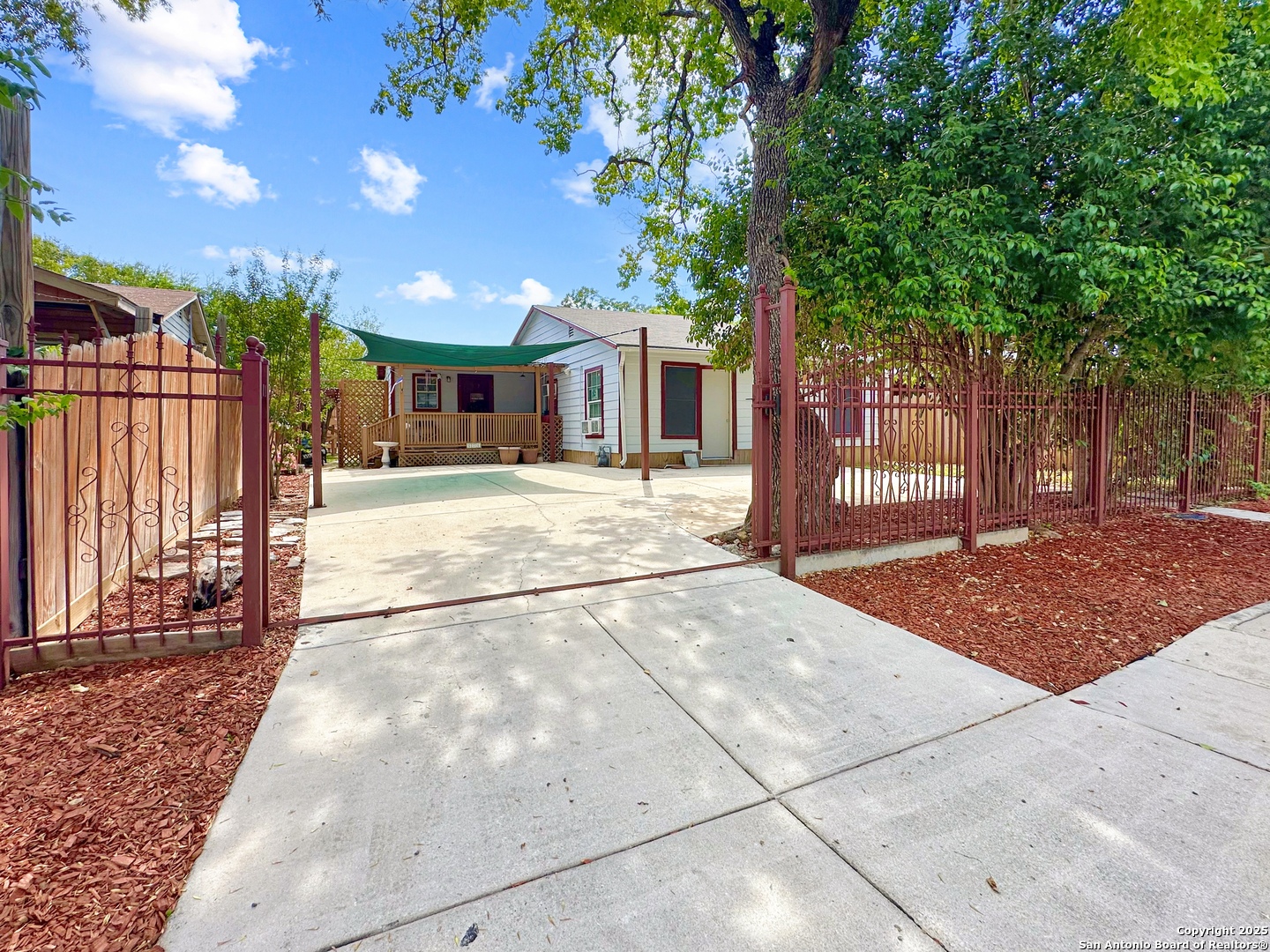 This cozy 4 bedroom, 2-full bath home is characterized by its charming and secure features. As you approach the home, you are greeted by a gated front yard, providing an extra layer of security and privacy. The front of the home features a covered front patio, perfect to relax and enjoy the outdoors. Whether you're sipping your morning coffee or enjoying a quiet evening, this covered patio offers a comfortable retreat. As you enter the home, you are greeted by an open dining and living room with high ceilings, creating a spacious and welcoming atmosphere. The interior is adorned with neutral paint, providing a warm and inviting ambiance, and an accent wall that adds a touch of personality to the space. Both the dining room and living room are equipped with ceiling fans for optimal air circulation. The large windows throughout the home bring in ample natural sunlight, creating a bright and cheerful environment. The separate kitchen boasts an abundance of cabinetry, providing ample storage space for all your kitchen essentials. The kitchen features a stainless steel gas burning stove, a ceramic tiled counter top and backsplash. The master suite is a generous 15x15 in size with a peak of a 10 foot ceiling and includes a ceiling fan for added comfort. It offers a peaceful retreat with its spacious layout. The master suite also features a stand-up shower tiled throughout and a single vanity in the ensuite bathroom. The three additional bedrooms in the home offer comfortable living quarters, each equipped with a ceiling fan and windows to allow for natural light. The shared bathroom includes a stand-up shower and a single vanity with nickel fixtures, catering to the needs of both residents and guests. The backyard of the home boasts a custom-built covered back patio, creating an ideal space for outdoor entertaining with the perfect backyard setting.
