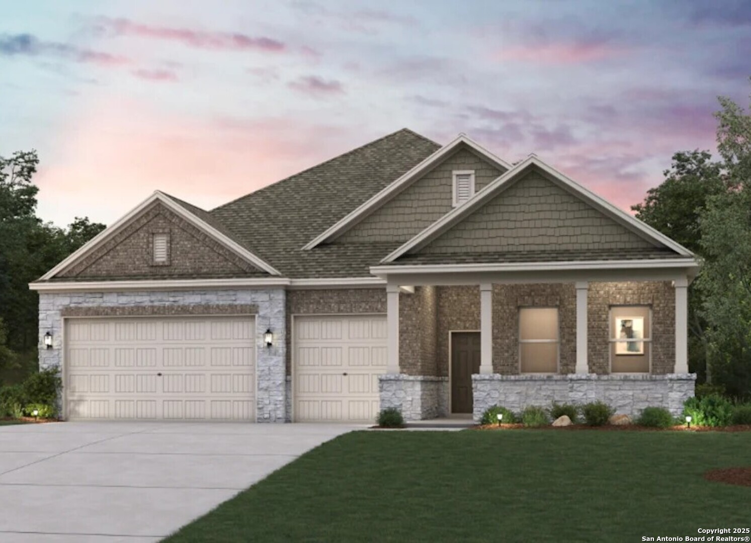 The sprawling Kenai floor plan centers around an open kitchen with a center island and an oversized walk-in pantry. A great room and a dining room are steps away, with a relaxing covered patio right outside. The expansive primary suite is adjacent, boasting a walk-in closet and a private bath with dual vanities and a walk-in shower. You'll also find a private study, three additional bedrooms, and a mud room in this attractive plan. Includes a 3-bay garage! Additional home highlights and upgrades: 42" white kitchen cabinets, quartz countertops and backsplash Luxury wood-look vinyl plank flooring in common areas Stainless-steel appliances with gas cooktop Additional recessed can lighting throughout home Walk-in shower and garden tub in Primary bath Black fixutures in all baths Upgraded electric fireplace Study at first floor with door Private bath at Bed 4 Cultured marble countertops and modern rectangular sinks in bathrooms Landscape package with sprinkler system Covered patio 3-bay garage with garage door opener and 2 remotes Exceptional included features, such as our Century Home Connect smart ho